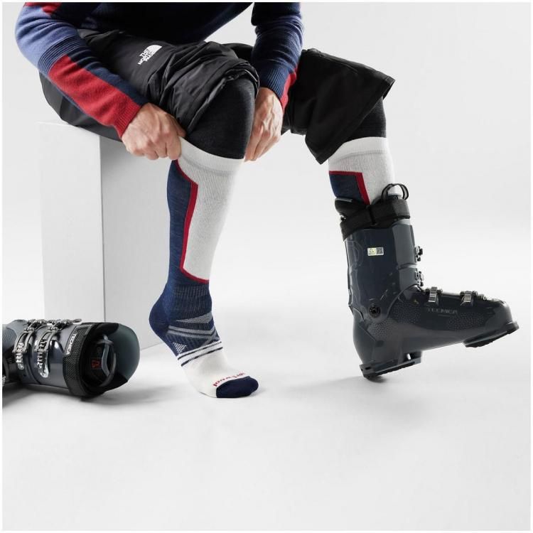 スキーツアーや長時間スキーを楽しむ人のためのスキーソックス。すね、足首、甲、足裏にフルクッションを配し、保温性とクッション性を兼ね備えています。
